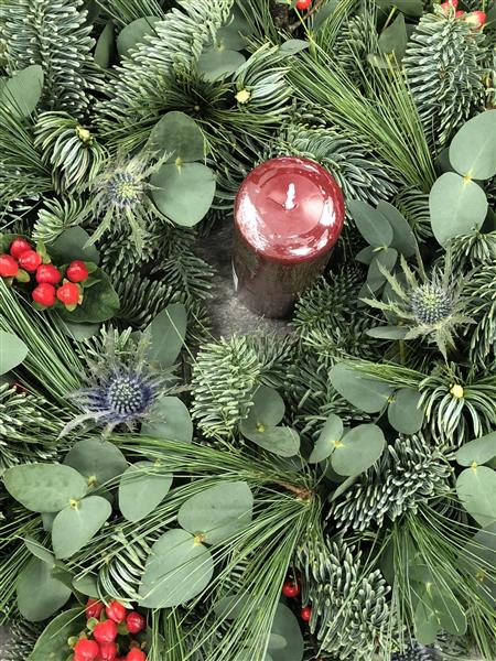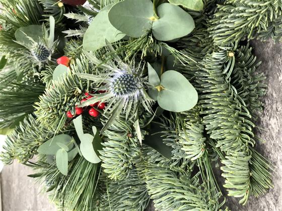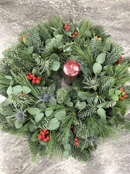 Scott’s Pine, Blue Pines and A touch of ilex Berries. We make it into an oasis Wreath ring so it stays fresh and can keep for ages.