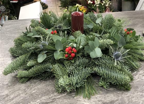 A beautiful mixed pine table centre. With a single pillar candle in the middle and mixed Eucalyptus, Berries and Thistles.