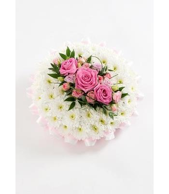 A Based Posy Pad with soft Pink Ribbons and Bright Pink Aqua Roses.