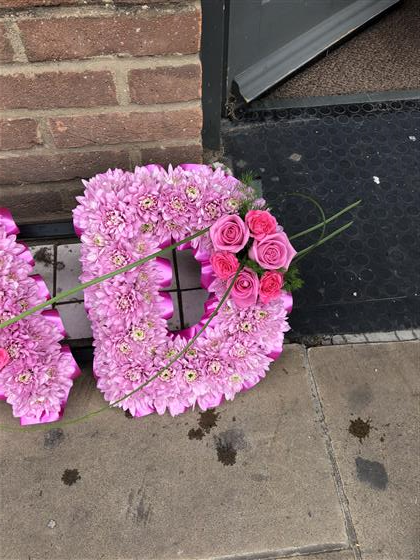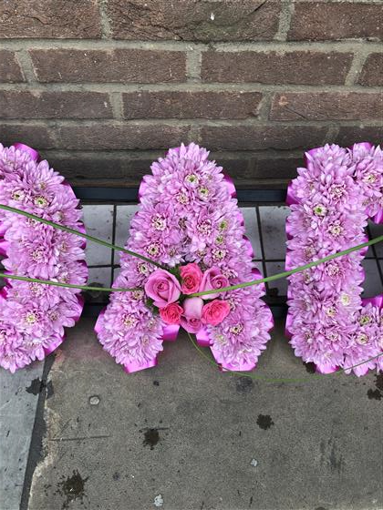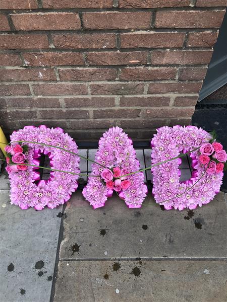 A DAD Funeral Tribute in Pink Chrysanthemum base and Pink Ribbons with Pink Rose Sprays.