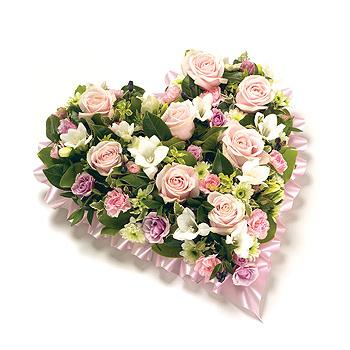 A Funeral Heart in Soft Pink shades. With a Pale Pink Ribbon edge, Heaven Pink Roses, White freesia, Pink Eustoma and some Lilac Spray Carnations.