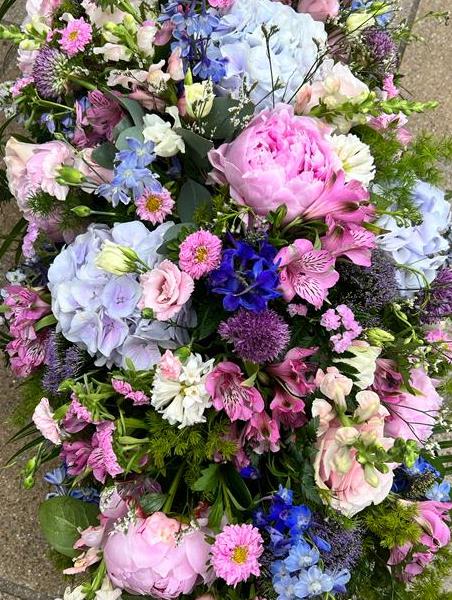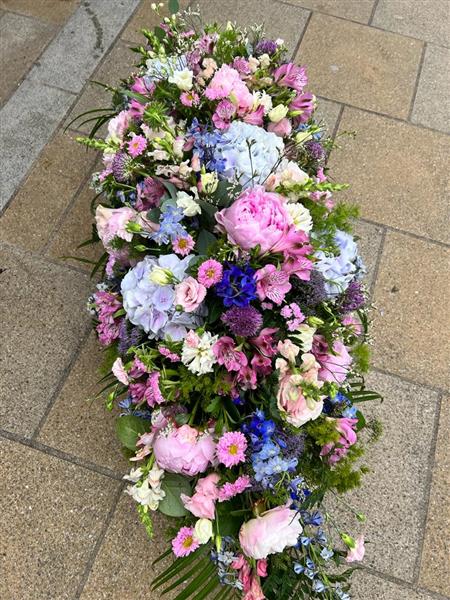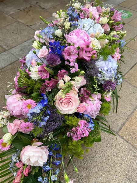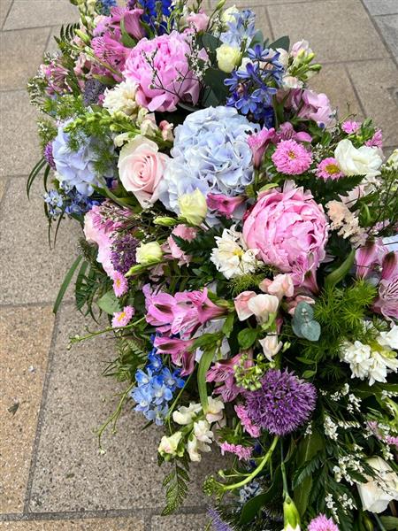 Pink and Blue Coffin Spray made with a selection of seasonal flowers.
