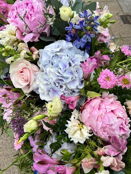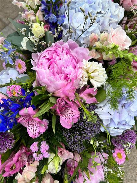 In the picture we used Peony, Delphiniums, Aster, Hydrangeas, Roses, Anthirinums, Alstro, Hyacinths, Alliums and Lisianthus.