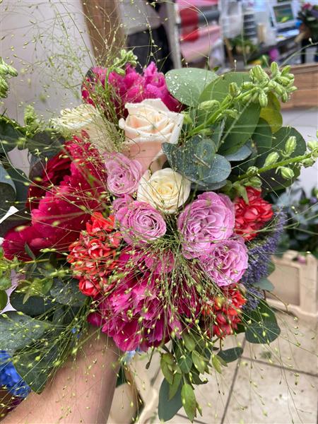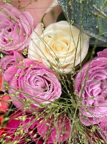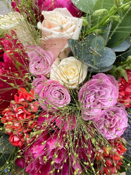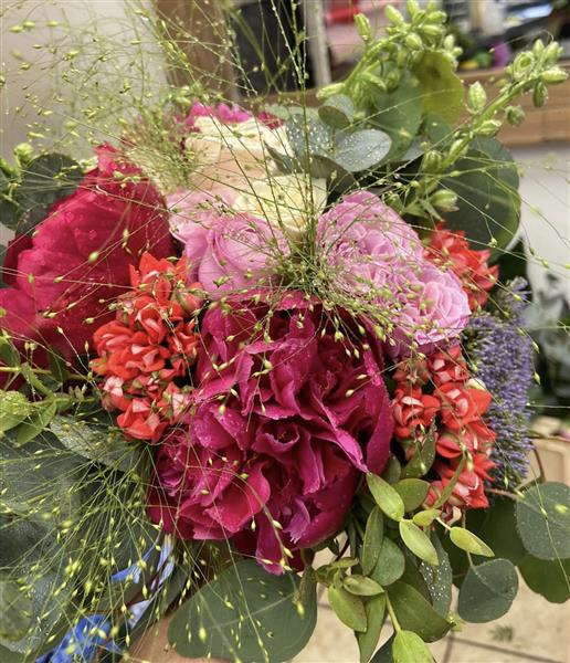 Dorchester Roses, White Avalanche Roses, Dusky Pink Spray roses, Lilac Trachelium, Burgundy Peony, Cerise Peony, Bouvardia, Larkspur Tails, Panicum Fountain Grass with mixed Eucalyptus.