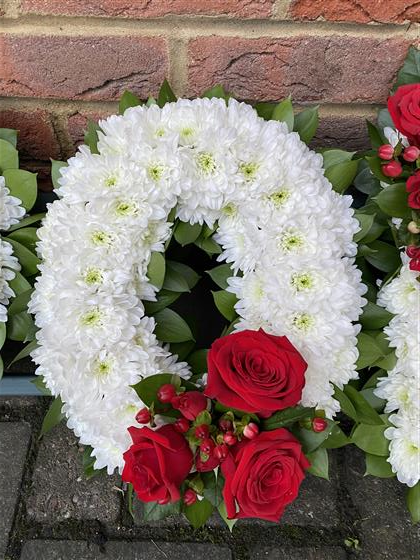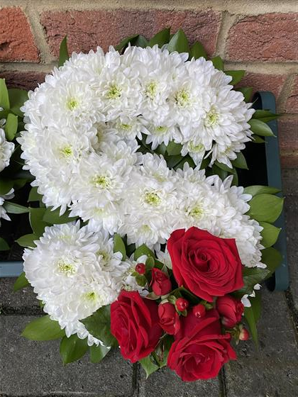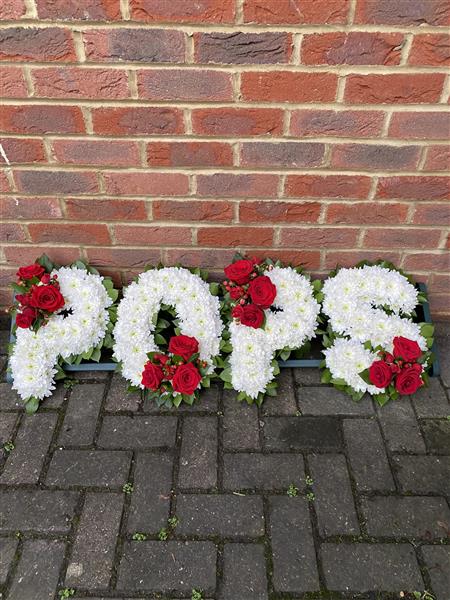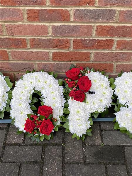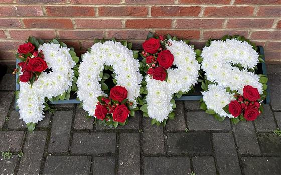 White base, Green Foliage edge with a spray on each letter of Baomi Red Roses and white