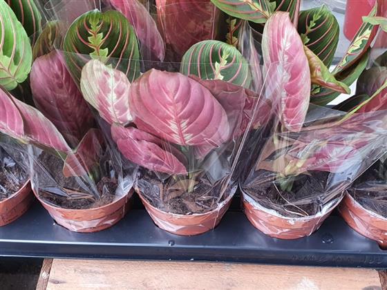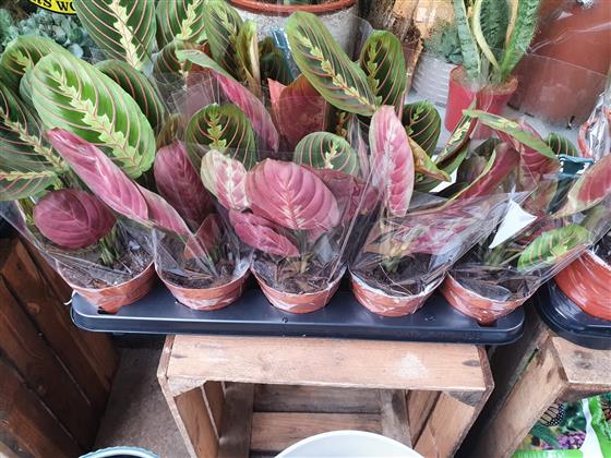 The green leaves of this handsome house plant are threaded with bright red veins, as well as attractively patterned along their midrib with yellow/green splotches. All in all, it's a showy plant, and curious too, as the leaves tend to fold their leaves up at night - which is why they are commonly referred to as prayer plants. Please note that the pot in the photograph is not supplied with the plant (which is sent out in a black plastic pot). They do however make excellent potted plants, and if you wish to pot yours up, we do have a wide range of pots on our website to choose from.