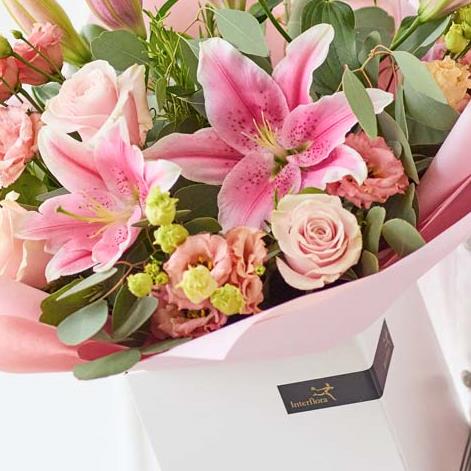 An abundance of pretty pink hues, this gorgeous bouquet features roses and lilies with complementary seasonal blooms exquisitely arranged and hand tied by a florist.