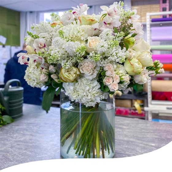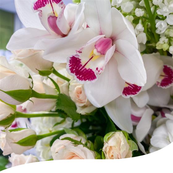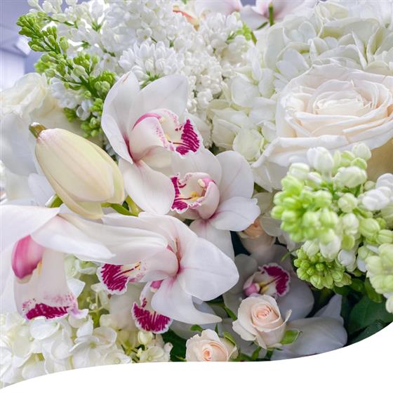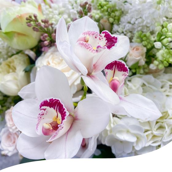 Our Pristine Orchid Opulence (Luxury) is a breathtaking vase arrangement that epitomises elegance and sophistication. This meticulously crafted display combines delicate Orchids, pristine White Roses, lush White Hydrangeas, graceful Patel Spray Roses, and fragrant White Stocks, all arranged to create a harmonious and stunning bouquet.