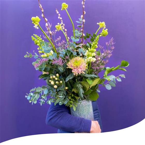 Our Purple Majesty Garden Vase Arrangement exudes elegance and charm, embodying the essence of a regal garden in full bloom. This hand-tied bouquet showcases a harmonious mix of Snapdragons, Limonium, Pussy Willow, Chrysanthemums, and more, creating a captivating tapestry of rich colours.