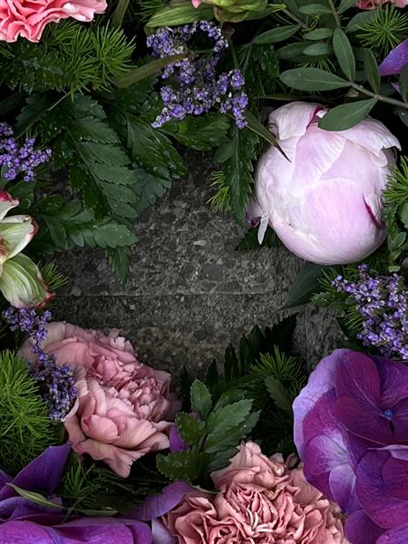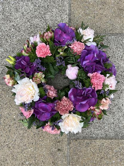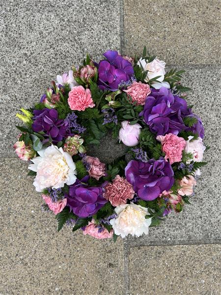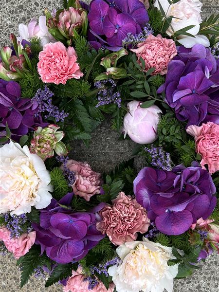 A seasonal mix of beautiful Purple and Pale Pink flowers arranged onto a wreath frame. We will use a mix of nice flowers such as roses, Peony, Hydrnageas, Carnations, Lisianthus,