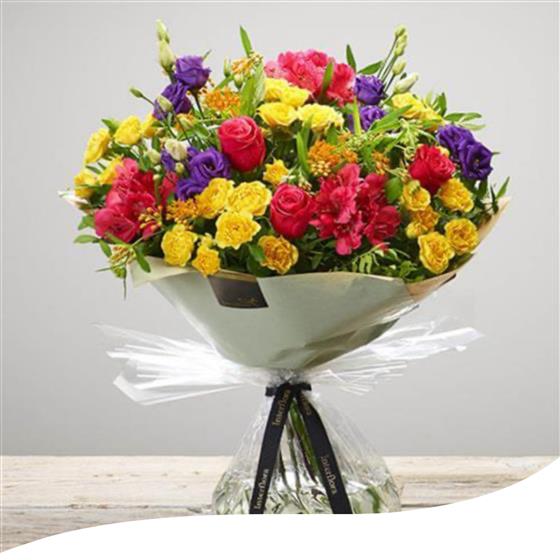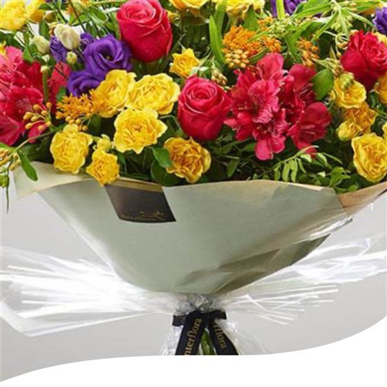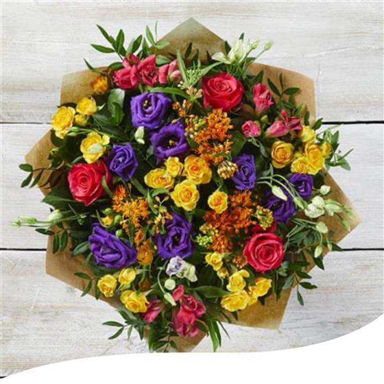 Presenting our Radiant Cerise Delight Hand-Tied — a vibrant composition of Cerise Large-Headed Roses, Cerise Alstroemeria, Orange Asclepia, Purple Lisianthus and Yellow Spray Roses. Expertly hand-tied and adorned with Pistache, this bouquet is a celebration of bold colours and varied textures.