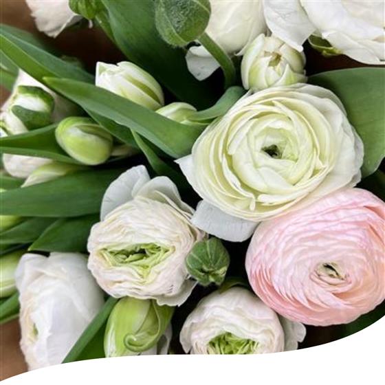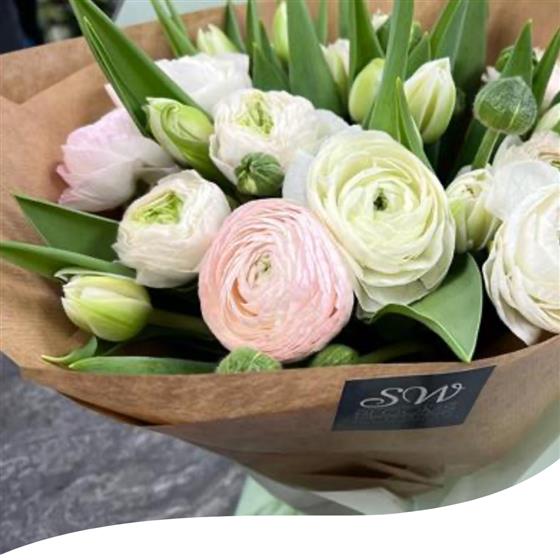 With a harmonious mix of colours and textures, this hand-tied bouquet offers a visual feast for the senses. The combination of ranunculus and tulips brings a touch of sophistication and natural beauty to any occasion.
