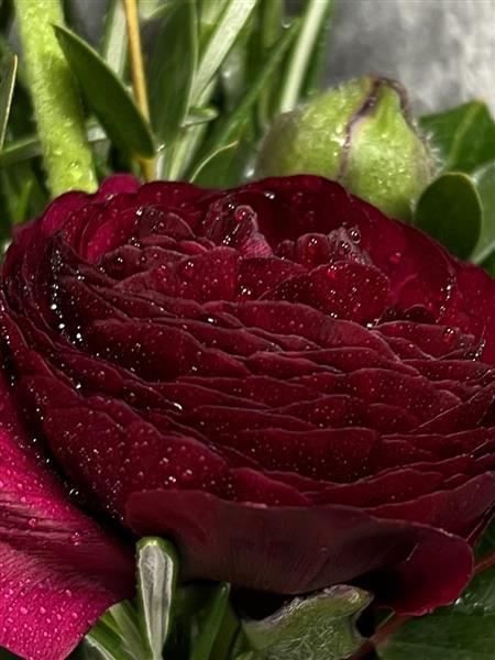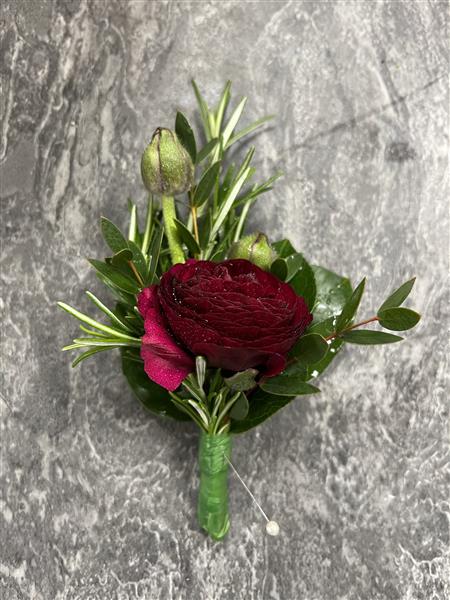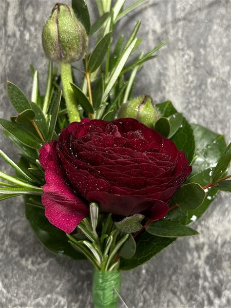 A burgundy Ranunculus Buttonhole with sprigs of Rosemary and small pieces of Eucalyptus.