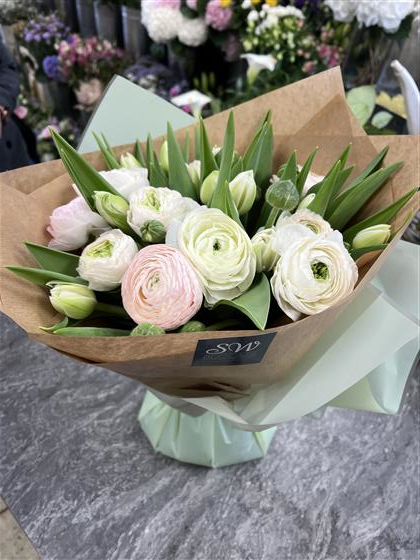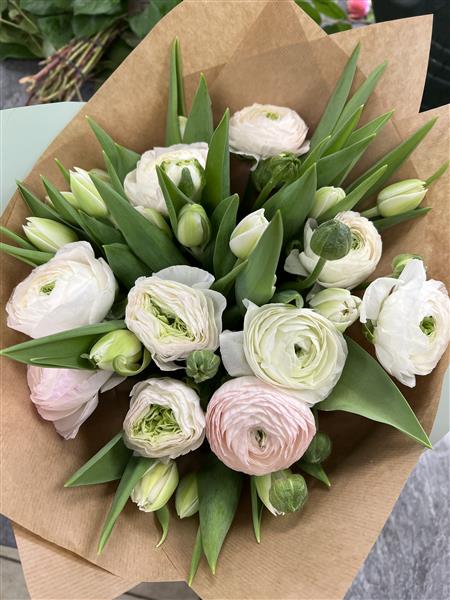 A mixed Tulip and Ranunculus Hand tied