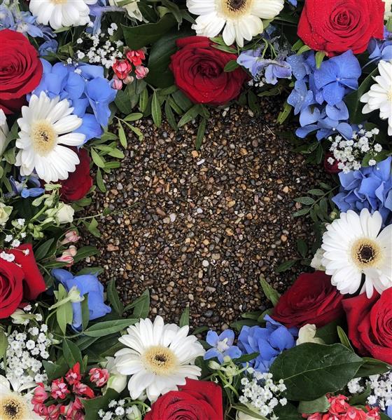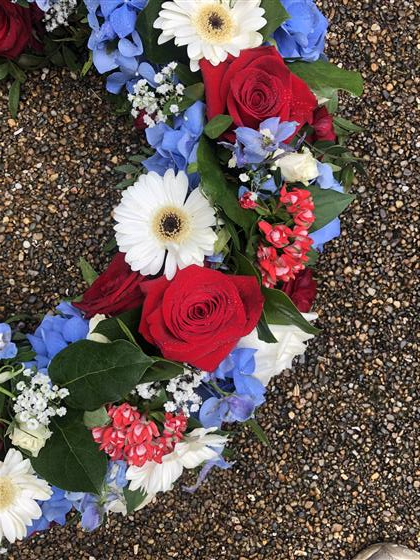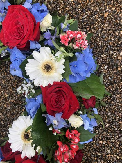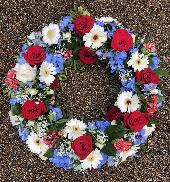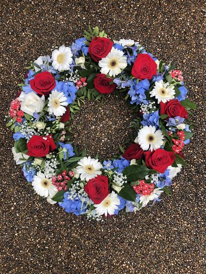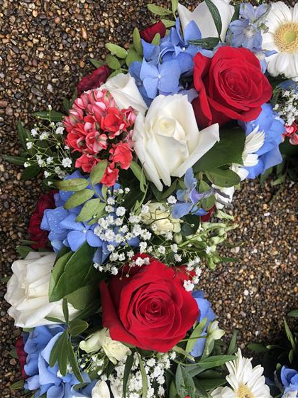 A Red, White and Blue funeral wreath. We will use seasonal flowers to create a wreath as close to the image as possible. This one is made with lots of Red Roses, Blue Hydrangeas, White Peonies(seasonal May-July) White Spray Roses and White Avalanche Roses, Red Bouvardia, White Gerberas, Blue Delphiniums and Gypsophilla,
