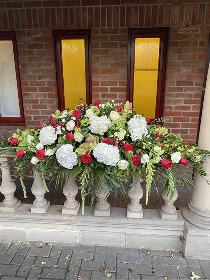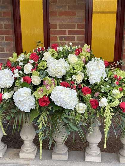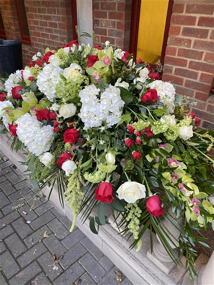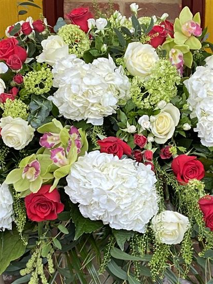 A beautiful casket spray that flows down the sides and covers the top of the casket. Lots of Red and White Roses, Green Cymbidium Orchids, White Hydrangeas, Trailing Amaranthus and Eucalyptus, White and Red Spray Roses. Mixed Greens including Panicum fountain Grass, Wild Thlaspi greenbell, Viburnum and Palm leaves and Ruscus.