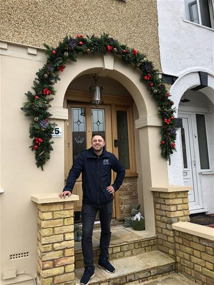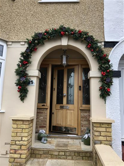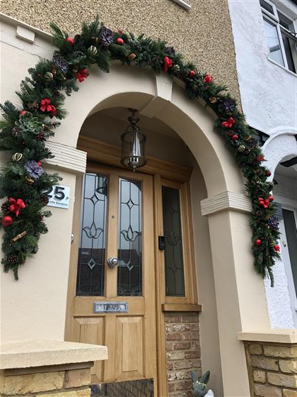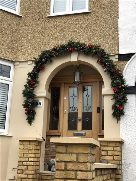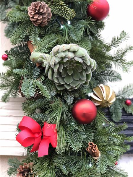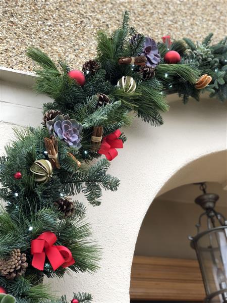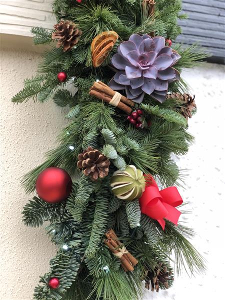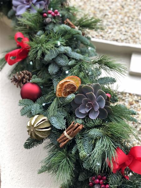 A beautiful Garland made with Blue Pine and Scots Pines decorated with mixed red decorations. Natural Pine Cones, Cinnamon Sticks, Dried Limes and Orange Slices. With Red Eleganza Bows, Red Berries and Red Baubles throughout. Finished with Purple and Green Echeveria Succulents.