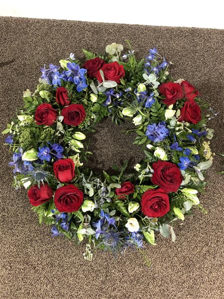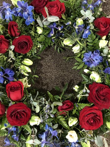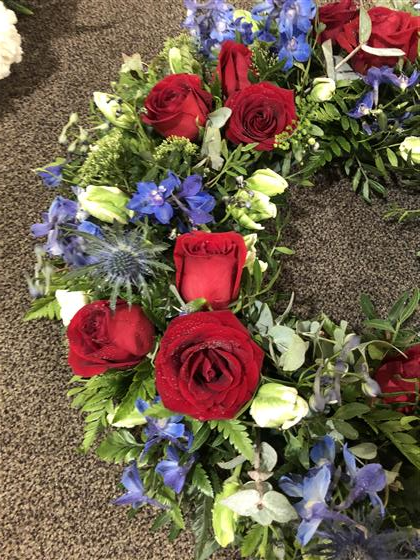 Made with mixed foliage and a lot of red Roses with blue Delphiniums and mixed White Flowers.