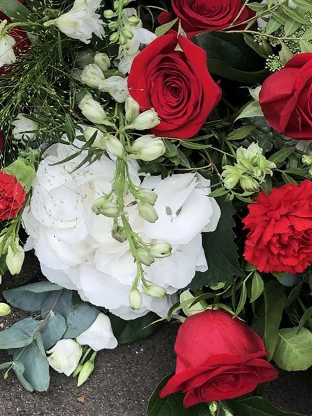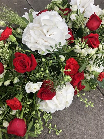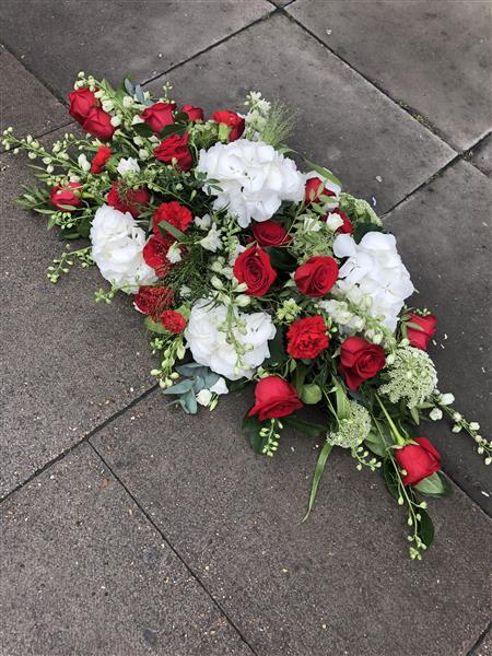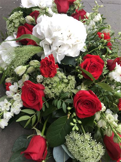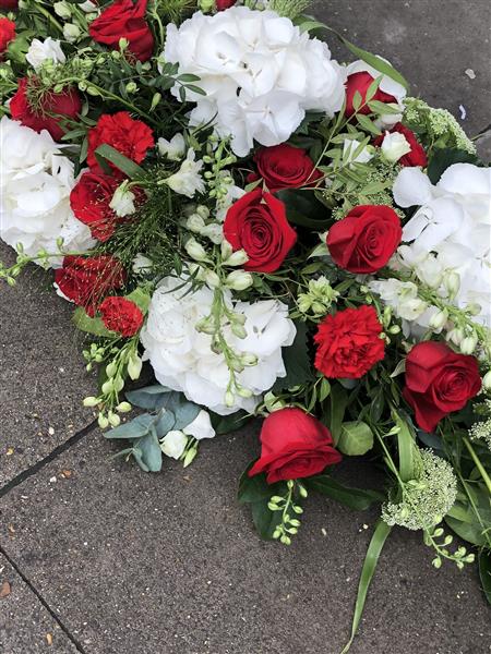A Coffin Spray made in Red, White and Green. We will use White Hydrangeas, Ammi Visnaga, White Delphinium or Larkspur, Red Roses, Red Carnations and a selection of choice foliage.