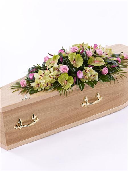 This distinctive casket spray brings together the soft green shades of cymbidium orchids and green anthurium, with delicate pink calla Lily, veronica and large-headed Rose. The spray is finished with aspidistra, aralia leaves, palm leaves and China grass. Approximate height 153cm (5ft).
