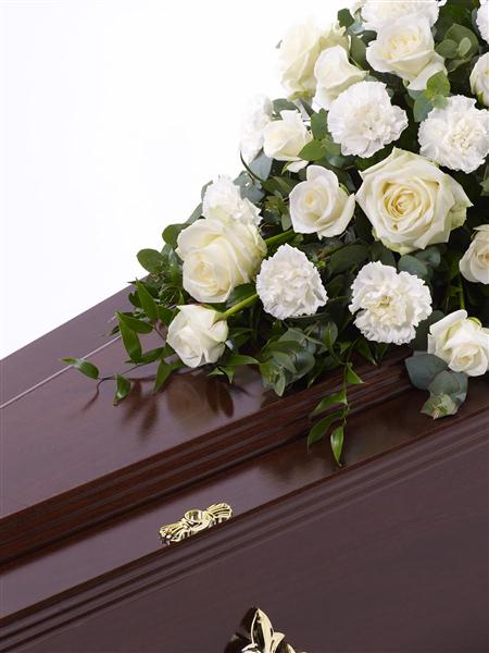 Large-headed white Rose combine with white carnations and luxurious foliages to create this traditional casket spray. Approximate height 122cm (4ft).