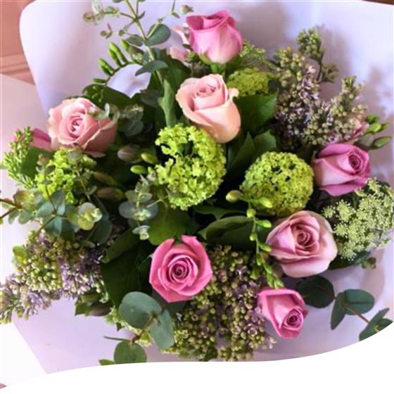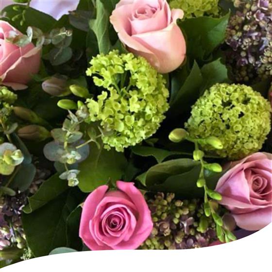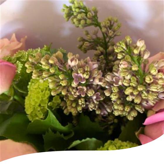 Experience the exquisite beauty of our Rosy Serenity Bouquet, showcasing a harmonious blend of Pink Roses, Viburnum, and Lilac Syringia. Enhanced by the aromatic notes of Eucalyptus and the delicate charm of Freesia, this thoughtfully curated arrangement exudes serenity and elegance.