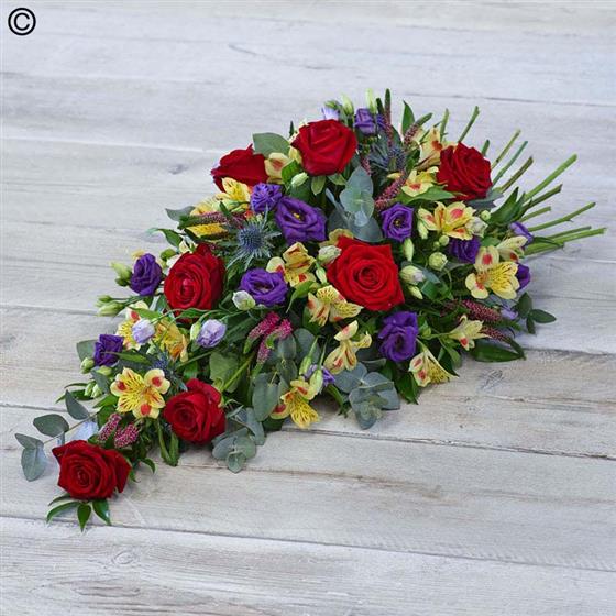 This teardrop shaped arrangement features blooms in a beautiful assortment of colours, including roses, lisianthus and alstroemeria.