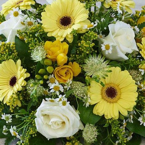 A pretty combination of fresh yellow and white blooms featuring germini, astrantia and fragrant freesias.