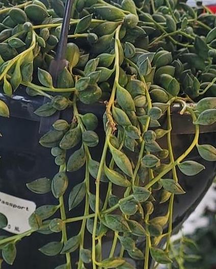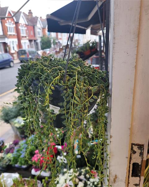 A large hanging basket of string of pearls. The real name for these beautiful and very popular plants is Senecio.
