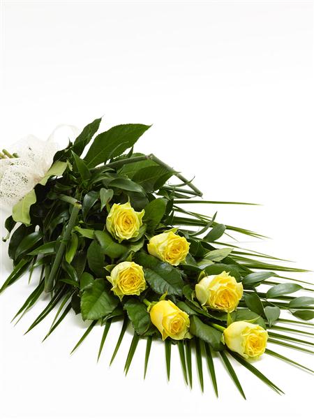 6 large-headed yellow roses are presented with aralia leaves, French ruscus and eucalyptus to create this simple, classic rose sheaf.