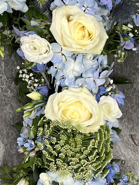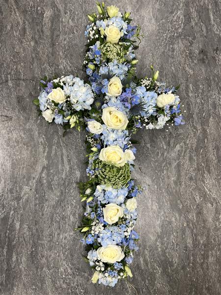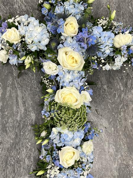 Sky Blue Cross tribute using blue hydrangeas, White roses, white Lisianthus, Ammi Visnaga, Gyp, Delphinium with Eucalyptus.