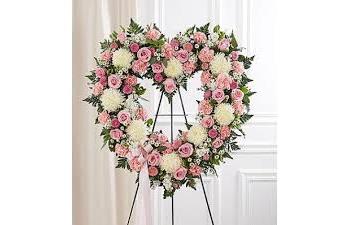 Soft Pink roses, Pink Eustoma, White Chrysanthemum blooms, Pale Pink Spray Carnations, White carnations and spray chrysanthemums are beautifully arranged to form an elegant wreath accented wth lush and vibrant greens. Displayed on a wire easel, this stunning tribute is a wonderful symbol of Love.