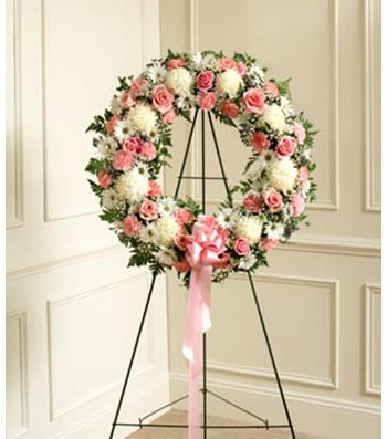 Pale Pink Heaven roses, Pink and white Oriental Lily, Dusky Pink carnations and mixed spray chrysanthemums are beautifully arranged to form an elegant wreath accented wth lush and vibrant greens. Displayed on a wire easel, this stunning tribute is a wonderful symbol of eternal life.