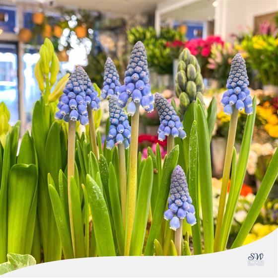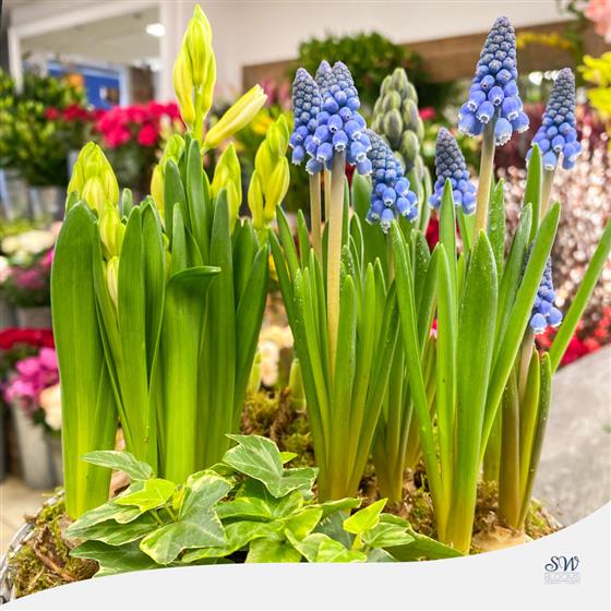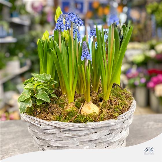 Explore the grace of our lovely basket filled with Muscari and Hyacinth bulbs, accompanied by Ivy. Carefully arranged by our florists, this basket is the perfect choice to bring the charm of spring into your living space. Whether on your windowsill, tabletop, as a centrepiece or a sweet gift.