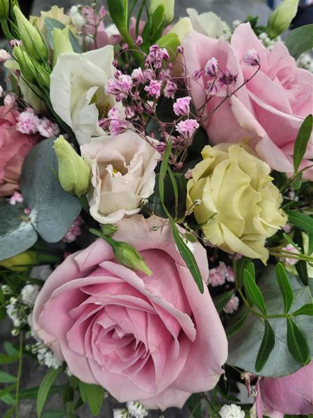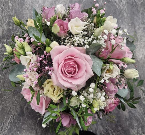 We will use a mix of flowers such as Pink Avalanche Roses, Dusky Pink Lisianthus, Gypsophila, White Freesia, Spray roses and mixed seasonal foliage.