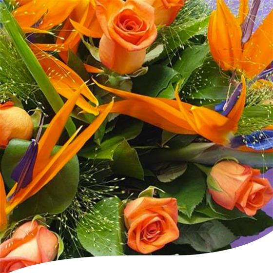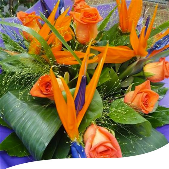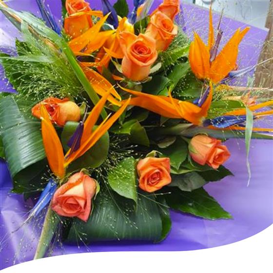 Celebrate a special occasion or brighten someone's day with our stunning Strelitzia & Roses Bouquet. Featuring the striking Strelitzia, also known as the Bird of Paradise, alongside vibrant orange Roses and lush foliage, this exquisite arrangement is expertly hand-tied, aqua-packed, and beautifully gift-wrapped to ensure both freshness and elegance.