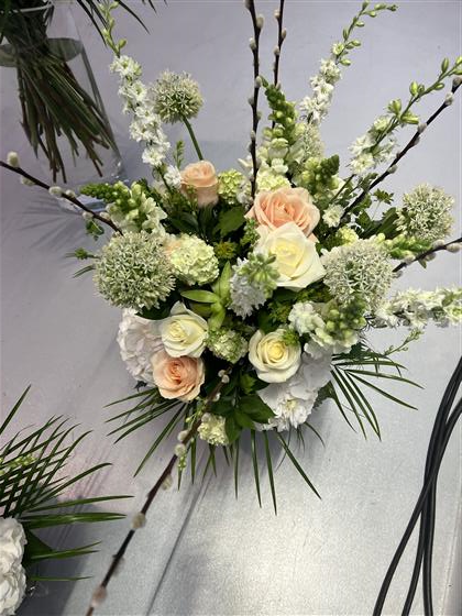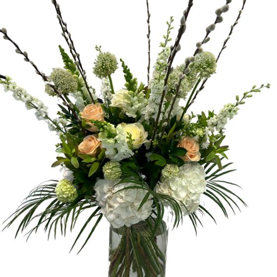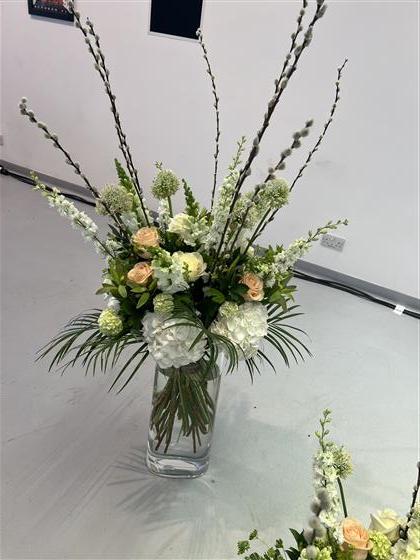 A tall stunning vase of White Flowers with 120cm Salix Pussy Willow’s.