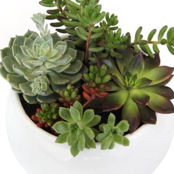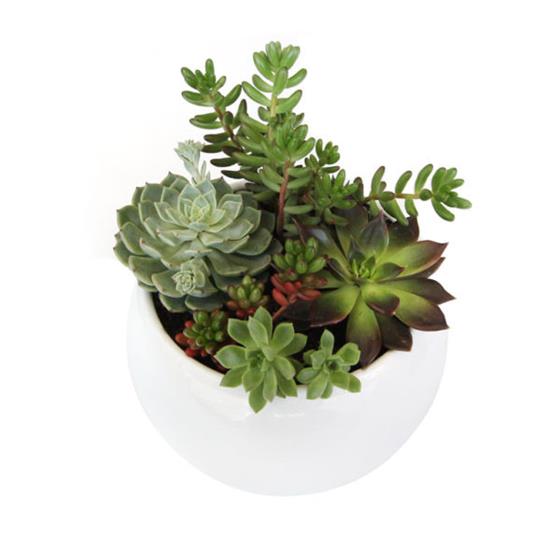 A bowl of expertly arranged mixed Succulents in a white gloss ceramic fish bowl, that requires watering but are long lasting.