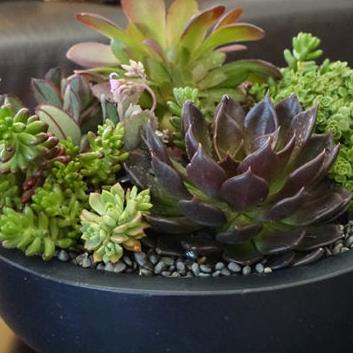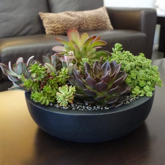 A mix of large and medium size succulents arranged into a black or dark grey ceramic pot.