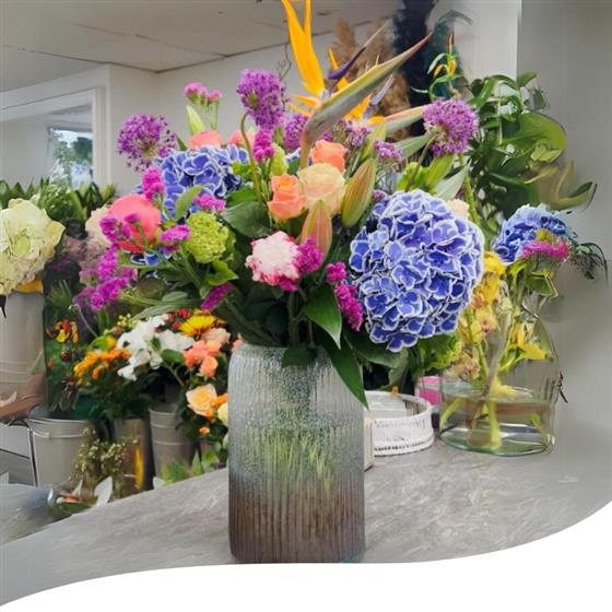 Featuring a selection of premium blooms, including Hydrangeas, Strelitzia, Pink Mundial Roses, Coral Sunset Peonies when in season, Sarah Bernhardt Peonies when in season, Lilies, Viburnum, Limonium Statice, Miss Piggy Roses and Alliums, this arrangement is a true celebration of the beauty of summer.