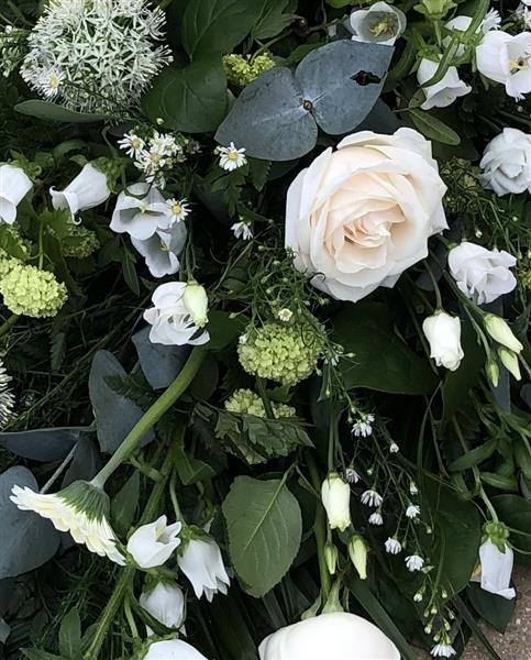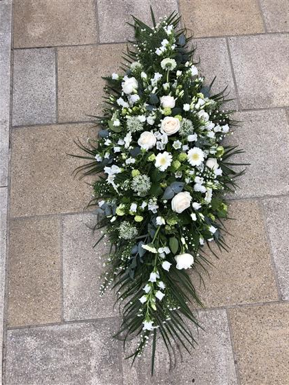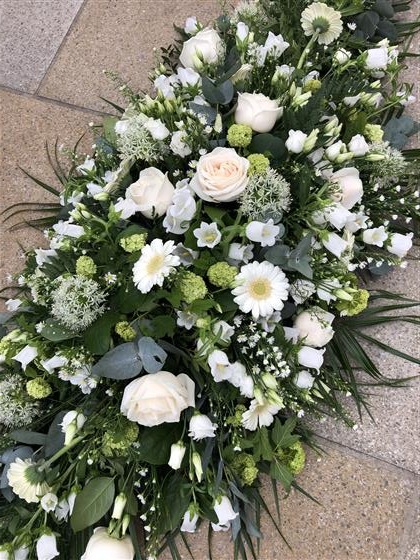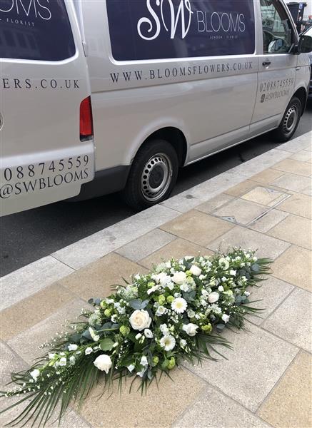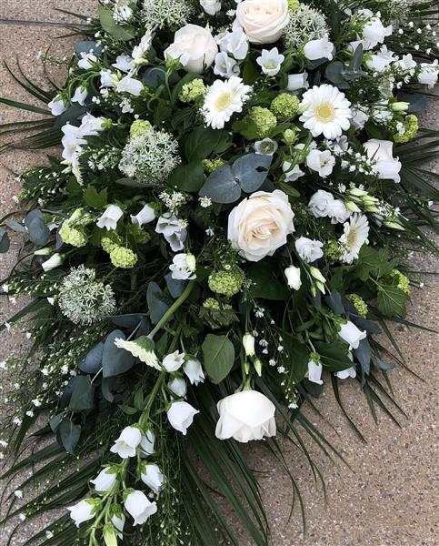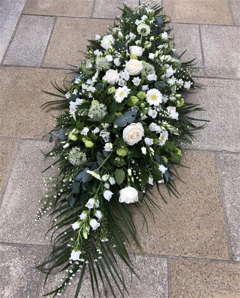 A White Seasonal Coffin Spray using Viburnum, Delphiniums, Roses, Gerberas, Alliums, Aster, September and Lisianthus.