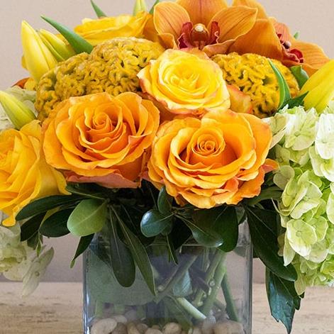 A stunning Orchid and Rose arrangement in mixed yellow and Gold shades. With Cymbidium Orchids, Golden Sphinx Roses, Yellow Celosias and pale green Hydrangeas. Perfect for any kind of gift and would look great on a coffee table or reception desk.