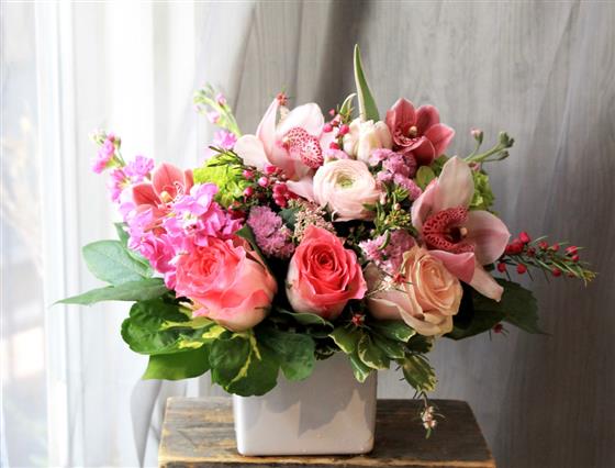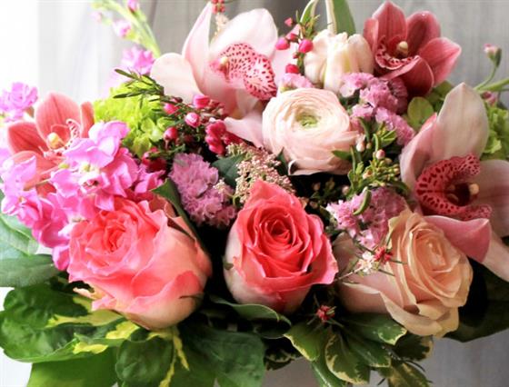 A soft pink table arrangement using pale pink shades of Cymbidium Orchids and Tulips, with lilac Stocks, pink Ranunculus and finished off with sprigs of mixed woodland foliage.