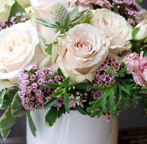 A luxurious white ceramic table arrangement with cream spray Roses, Carnations and Sweet Williams with green Eringium thistles finishing this arrangement.