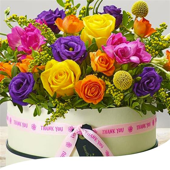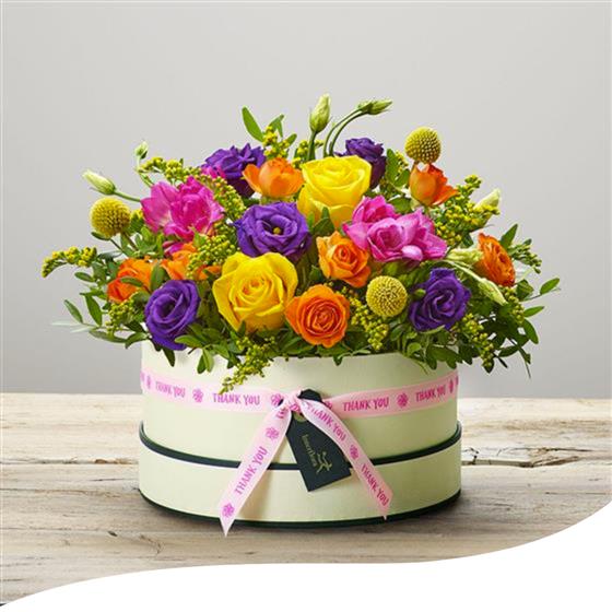 Brighten up your space with our Thank You Candy Pop Hatbox arrangement! This vibrant selection is a celebration of summer, featuring yellow Roses, Orange Spray Roses, Purple Lisianthus, Solidago, Cerise Freesia, and an assortment of lush foliage. Presented in water within a sleek black hatbox, this arrangement is an ideal way to convey your appreciation and add a splash of colour and joy to any setting.