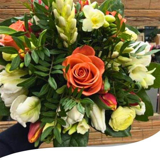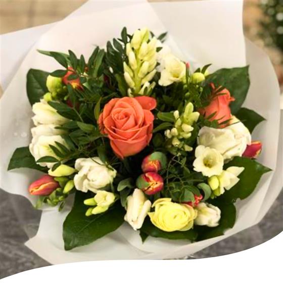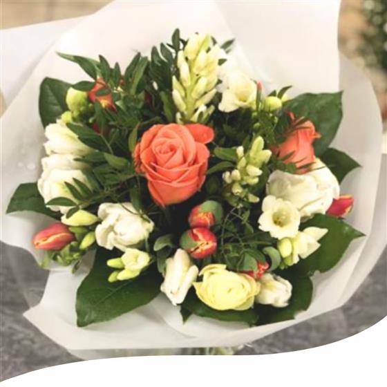 This lovely arrangement boasts a blend of fragrant flowers including Orange Roses, Ranunculus, White Freesia, White Parrot Tulips, Orange Tulips, and White Hyacinths, complemented by Pistache and Eucalyptus foliage. This bouquet arrives in water with full gift wrapping, ready to make a stunning impression.