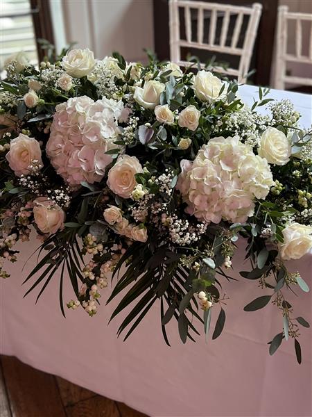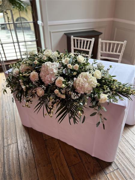 A top table arrangement using a nice mixture of flowers ready to match the wedding theme.