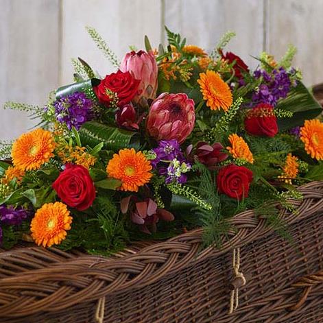 A fragrant spray of vibrant tropical tones and blooms including protea, stocks and germini.