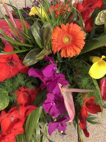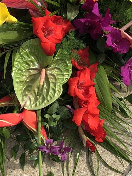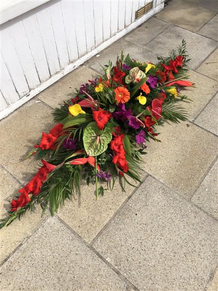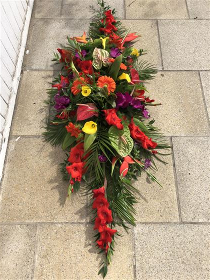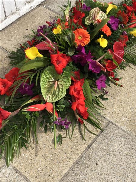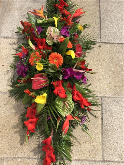 A tropical coffin spray using really bright vibrant colours including Heliconias, Yellow Calla’s, Orange Gerbera, Bright cerise or purple Vandha Orchids, green and red Anthuriums, Palm leaves and other tropical foliage.