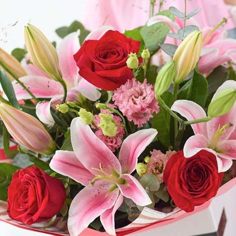 A gorgeous mix of the finest red roses, striking pink oriental lilies and other romantic blooms. A fiery and passionate bouquet for a Valentine's Day sweetheart.